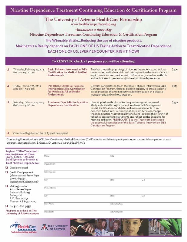 The University of Arizona HealthCare Partnership invites you to a three-day Certification and Continuing Education Program to Treat Nicotine Dependence.