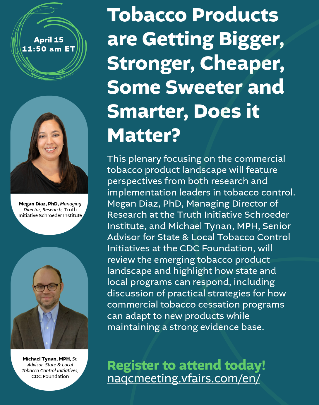 Dear Colleagues, The NAQC Annual Meeting is just around the corner, and we hope you’ll join us for this dynamic virtual event on April 15–16, 2026. Register now to connect with peers, discover fresh ideas, and celebrate innovative approaches to quitline services. This year’s program features an exceptional lineup of plenary sessions led by national tobacco control experts who will share insights on emerging trends, innovative strategies to strengthen quitline services, and practical lessons that support long-term program sustainability. We are excited to spotlight our second plenary titled “Tobacco Products are Getting Bigger, Stronger, Cheaper, Some Sweeter and Smarter, Does it Matter?”. |