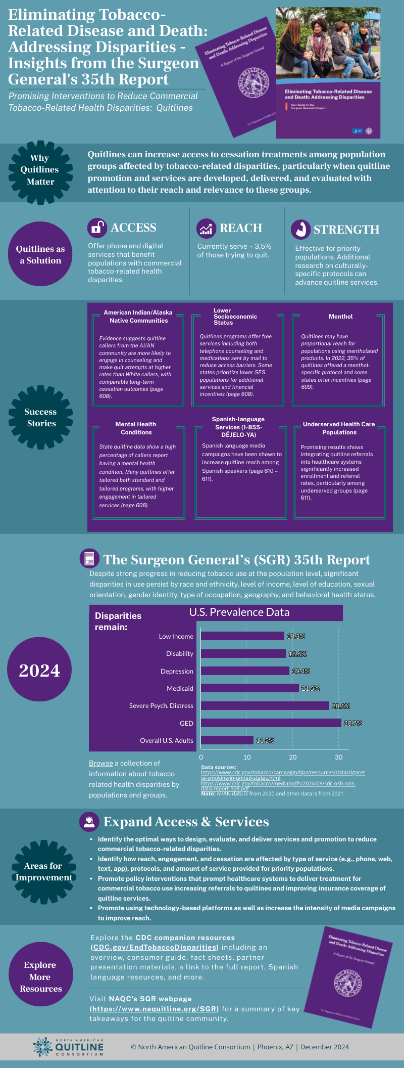 We have prepared an infographic (PNG copy) and an executive summary which provide key findings and highlights for the quitline community from the report. Additional resources will be added to this page as they are released.